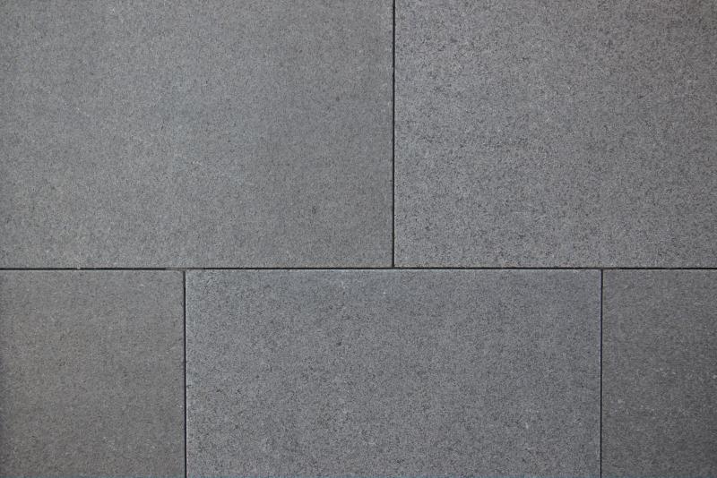 Terrassenplatte Gabbro Svart Impala, geflammt und gebürstet, Kanten gefast